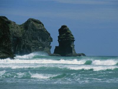 Situated on the west coast of the north island 40 kms from the city of auckland this black iron sand beach has a reputation for awesome surf which rolls in over the tasman sea. There are incredibly strong tides and waves which can be very dangerous. With rugged cliffs and the majestic lion rock standing.